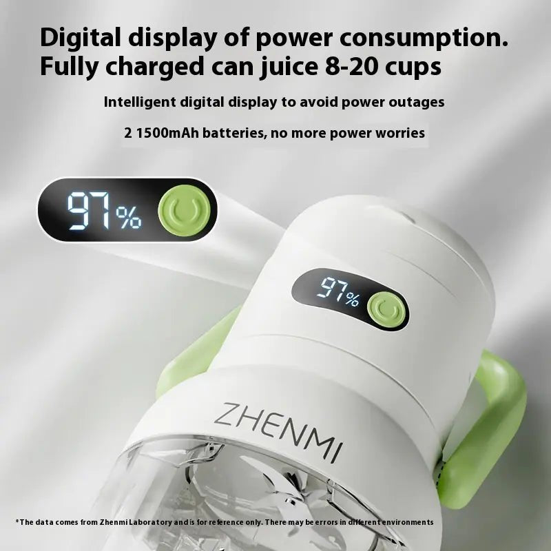 Compact and rechargeable juicer for home or on-the-go. 150W motor, stainless steel liner, metal body, 400ml capacity. Perfect for juicing, ice crushing, and mixing. Available in Avocado Green and Taro Purple.