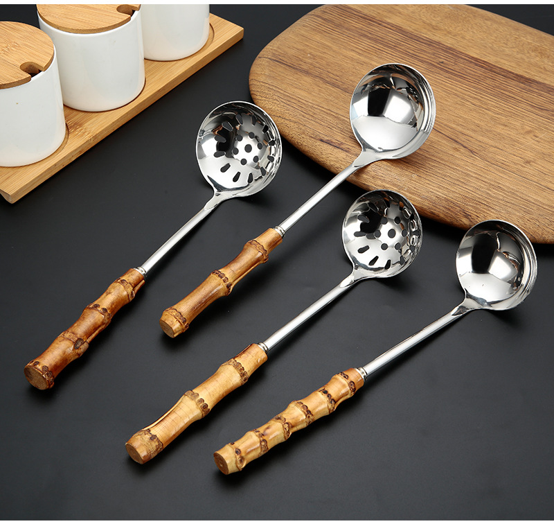 Featuring a beautiful bamboo handle that provides a comfortable grip, each utensil in this set is crafted from high-grade stainless steel, ensuring durability and long-lasting performance. The sleek silver finish not only enhances the aesthetic of your kitchen but also makes cleaning a breeze.